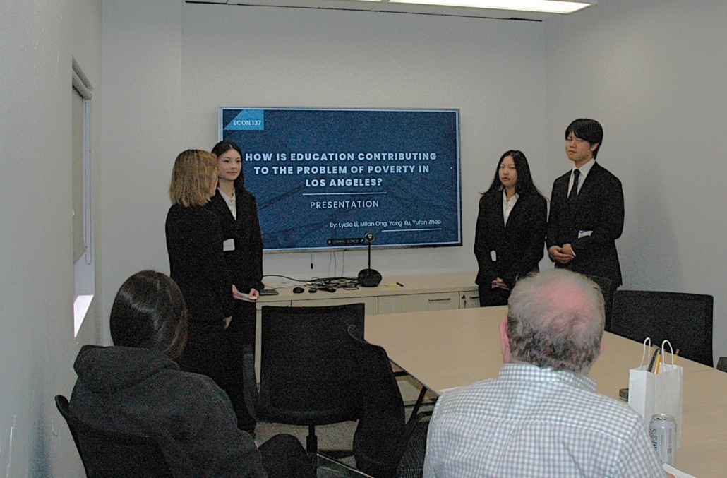 Working in groups of four, students delivered 15-minute presentations followed by five minutes of Q&A. Presentation topics ranged from the collapse of Lehman Brothers and current challenges in venture capital to pressing issues facing Los Angeles, including its high cost of living and vulnerability to natural disasters.